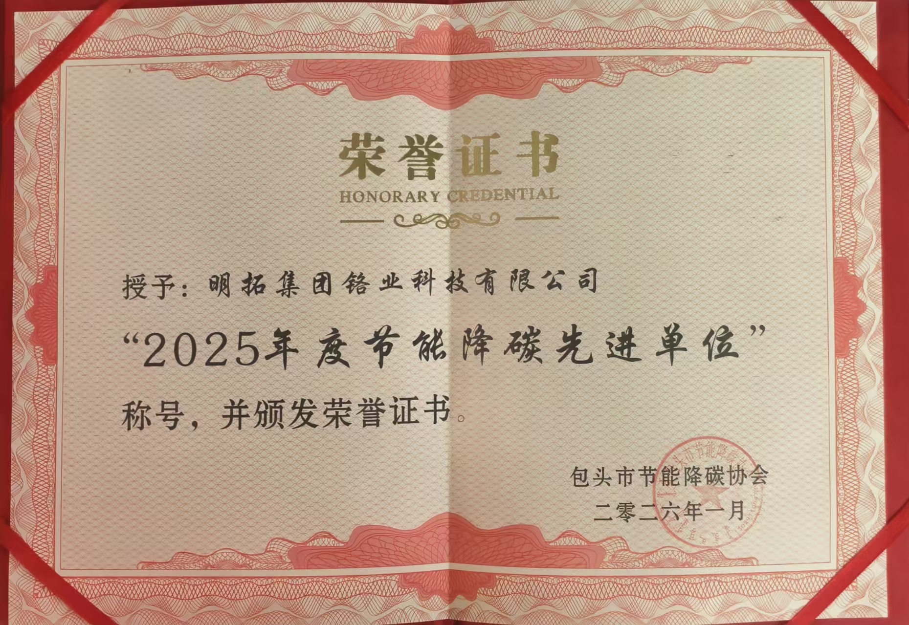 2026年1月,包头市节能降碳协会举办了2025年年会暨年度表彰大会,明拓集团铬业科技有限公司凭借其在绿色低碳发展方面的卓越实践与突出贡献,成功获评“2025年度节能降碳先进单位”荣誉称号。同时,公司凭借其行业影响力与在节能降碳领域的引领作用,被推选为包头节能降碳协会第三届理事会“节能降碳副会长单位”。